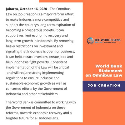 "Undang-Undang Cipta Kerja adalah upaya reformasi besar untuk menjadikan Indonesia lebih kompetitif." Ini kata Bank Dunia. Berikut pernyataan lengkapnya. https://t.co/AI3TmGposwKPK